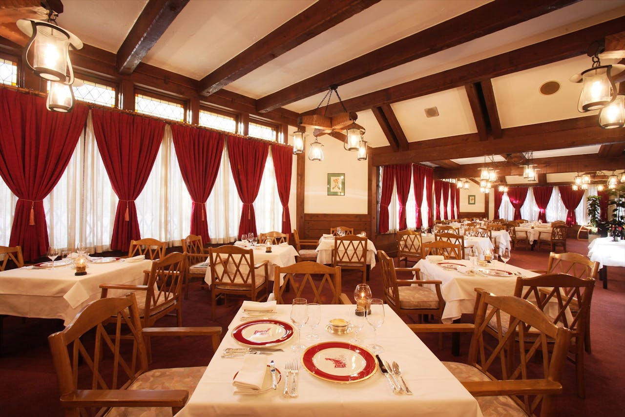 草分けとして、数多くの賓客から親しまれてきた太い梁が木のぬくもりと重厚さをに醸し、中央のボルともなっています。