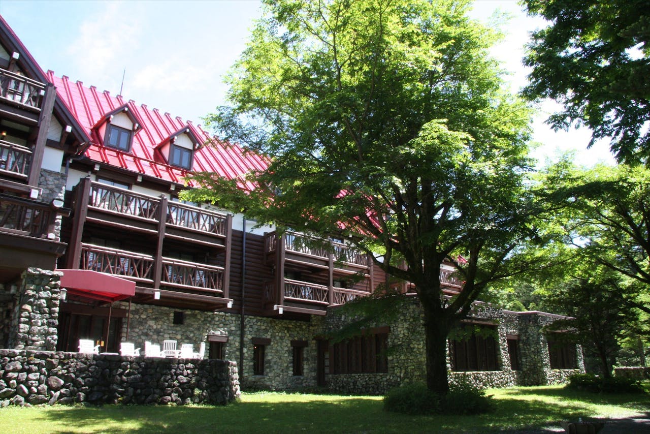 緑まぶし高原の木立の間に佇むリゾートホテル。