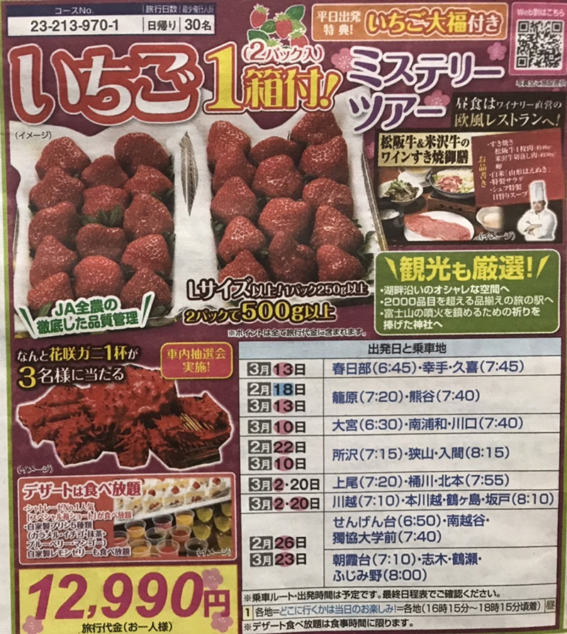 【埼玉県内発】 ワイナリー直営店で松阪牛&米沢牛!ケーキ&プリン!いちご1箱付きミステリーツアー