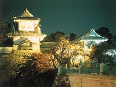 長町武家屋敷の「こも掛け」雪国地方独特のもの ▲冬期間限定で金沢城と兼六園がライトアップ