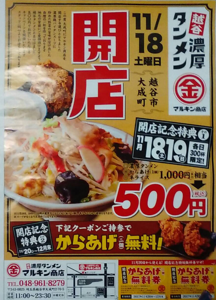 マルキン商店『越谷濃厚タンメン』11月18 (土)開店!!記念開店特典