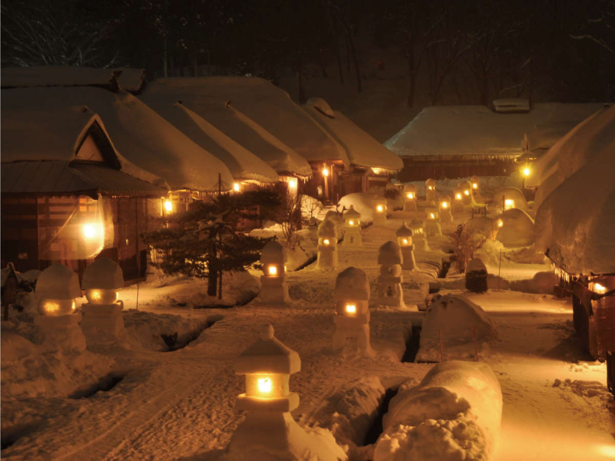 *この国重要伝統的建造物群保存地区に選定されている南会津の大内宿では、例年2月に、雪灯籠に照らし出される幻想的な雪まつりが行われます。