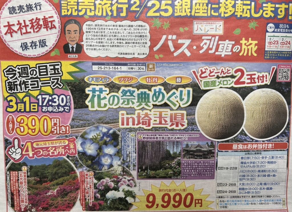 各地=【○箭弓稲荷神社】(各自参拝と園内に咲く牡丹と藤観賞)=<5km>=【●東松山ぼたん園】(入園)=<4km>=【●国営武蔵丘陵森林公園】(ネモフィラ観賞)=<20km>=【●五大尊つつじ公園】(入園)=各地(14時45分~16時30分頃)