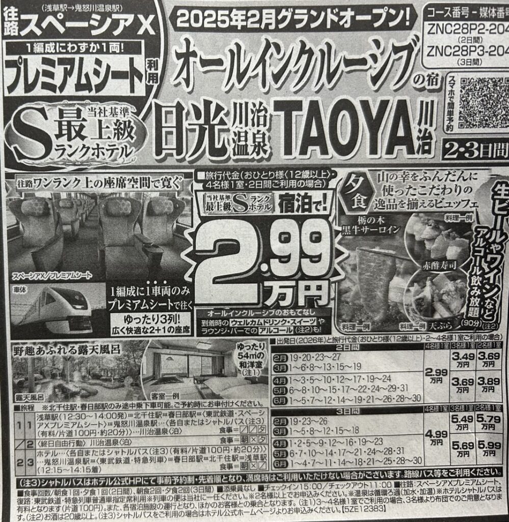 往路スペーシアXプレミアムシート 当社基準Sランク オールインクルーシブの宿日光川治温泉 TAOYA川治 2日間